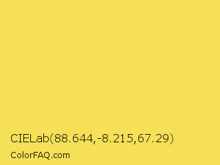 CIELab 88.644,-8.215,67.29 Color is a light yellow color and the nearest color is Energy Yellow #f8dd5c. Hex code #f5e057 and RGB value is rgb(245,224,87). In RGB color space, this color is composed of 96% red, 88% green, 34% blue, In CMYK color space, this color is composed of 0% cyan, 9% magenta, 64% yellow , 4% black , In HSL color space, this color has a hue angle of 52° , 89% saturation and 65% lightness.