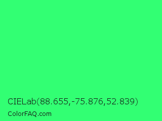 CIELab 88.655,-75.876,52.839 Color is a normal green color and the nearest color is UFO Green #3cd070. Hex code #32ff73 and RGB value is rgb(50,255,115). In RGB color space, this color is composed of 20% red, 100% green, 45% blue, In CMYK color space, this color is composed of 80% cyan, 0% magenta, 55% yellow , 0% black , In HSL color space, this color has a hue angle of 139° , 100% saturation and 60% lightness.