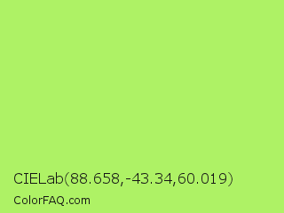 CIELab 88.658,-43.34,60.019 Color is a light green color and the nearest color is Inchworm #b2ec5d. Hex code #aef265 and RGB value is rgb(174,242,101). In RGB color space, this color is composed of 68% red, 95% green, 40% blue, In CMYK color space, this color is composed of 28% cyan, 0% magenta, 58% yellow , 5% black , In HSL color space, this color has a hue angle of 89° , 84% saturation and 67% lightness.