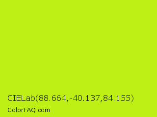 CIELab 88.664,-40.137,84.155 Color is a normal lime color and the nearest color is Las Palmas #c6e610. Hex code #bff016 and RGB value is rgb(191,240,22). In RGB color space, this color is composed of 75% red, 94% green, 9% blue, In CMYK color space, this color is composed of 20% cyan, 0% magenta, 91% yellow , 6% black , In HSL color space, this color has a hue angle of 73° , 88% saturation and 51% lightness.