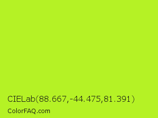 CIELab 88.667,-44.475,81.391 Color is a normal lime color and the nearest color is Green Yellow #adff2f. Hex code #b5f225 and RGB value is rgb(181,242,37). In RGB color space, this color is composed of 71% red, 95% green, 15% blue, In CMYK color space, this color is composed of 25% cyan, 0% magenta, 85% yellow , 5% black , In HSL color space, this color has a hue angle of 78° , 89% saturation and 55% lightness.