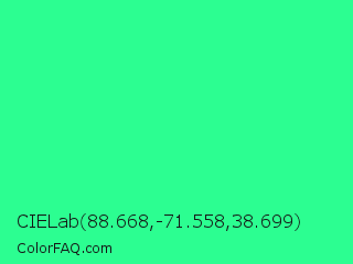 CIELab 88.668,-71.558,38.699 Color is a normal green color and the nearest color is Medium Spring Green #00fa9a. Hex code #2cfe91 and RGB value is rgb(44,254,145). In RGB color space, this color is composed of 17% red, 100% green, 57% blue, In CMYK color space, this color is composed of 83% cyan, 0% magenta, 43% yellow , 0% black , In HSL color space, this color has a hue angle of 149° , 99% saturation and 58% lightness.