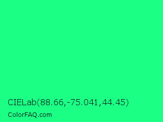 CIELab 88.66,-75.041,44.45 Color is a normal green color and the nearest color is Spring Green #00ff7f. Hex code #1bff85 and RGB value is rgb(27,255,133). In RGB color space, this color is composed of 11% red, 100% green, 52% blue, In CMYK color space, this color is composed of 89% cyan, 0% magenta, 48% yellow , 0% black , In HSL color space, this color has a hue angle of 148° , 100% saturation and 55% lightness.