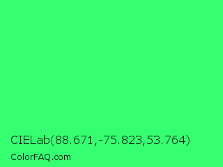 CIELab 88.671,-75.823,53.764 Color is a normal green color and the nearest color is UFO Green #3cd070. Hex code #35ff71 and RGB value is rgb(53,255,113). In RGB color space, this color is composed of 21% red, 100% green, 44% blue, In CMYK color space, this color is composed of 79% cyan, 0% magenta, 56% yellow , 0% black , In HSL color space, this color has a hue angle of 138° , 100% saturation and 60% lightness.