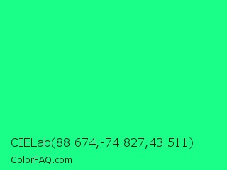 CIELab 88.674,-74.827,43.511 Color is a normal green color and the nearest color is Spring Green #00ff7f. Hex code #19ff87 and RGB value is rgb(25,255,135). In RGB color space, this color is composed of 10% red, 100% green, 53% blue, In CMYK color space, this color is composed of 90% cyan, 0% magenta, 47% yellow , 0% black , In HSL color space, this color has a hue angle of 149° , 100% saturation and 55% lightness.