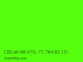 CIELab 88.679,-77.784,83.15 Color is a normal green color and the nearest color is Chlorophyll Green #4aff00. Hex code #55ff0f and RGB value is rgb(85,255,15). In RGB color space, this color is composed of 33% red, 100% green, 6% blue, In CMYK color space, this color is composed of 67% cyan, 0% magenta, 94% yellow , 0% black , In HSL color space, this color has a hue angle of 103° , 100% saturation and 53% lightness.
