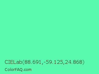 CIELab 88.691,-59.125,24.868 Color is a light green color and the nearest color is Medium Aquamarine #66ddaa. Hex code #59faad and RGB value is rgb(89,250,173). In RGB color space, this color is composed of 35% red, 98% green, 68% blue, In CMYK color space, this color is composed of 64% cyan, 0% magenta, 31% yellow , 2% black , In HSL color space, this color has a hue angle of 151° , 94% saturation and 66% lightness.