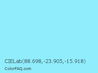 CIELab 88.698,-23.905,-15.918 Color is a light cyan color and the nearest color is Anakiwa #9de5ff. Hex code #90edfc and RGB value is rgb(144,237,252). In RGB color space, this color is composed of 56% red, 93% green, 99% blue, In CMYK color space, this color is composed of 43% cyan, 6% magenta, 0% yellow , 1% black , In HSL color space, this color has a hue angle of 188° , 95% saturation and 78% lightness.