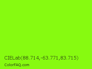 CIELab 88.714,-63.771,83.715 Color is a normal green color and the nearest color is Chartreuse #7fff00. Hex code #87fa10 and RGB value is rgb(135,250,16). In RGB color space, this color is composed of 53% red, 98% green, 6% blue, In CMYK color space, this color is composed of 46% cyan, 0% magenta, 94% yellow , 2% black , In HSL color space, this color has a hue angle of 89° , 96% saturation and 52% lightness.