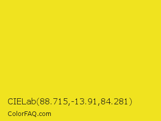 CIELab 88.715,-13.91,84.281 Color is a normal yellow color and the nearest color is Ripe Lemon #f4d81c. Hex code #f0e31f and RGB value is rgb(240,227,31). In RGB color space, this color is composed of 94% red, 89% green, 12% blue, In CMYK color space, this color is composed of 0% cyan, 5% magenta, 87% yellow , 6% black , In HSL color space, this color has a hue angle of 56° , 87% saturation and 53% lightness.