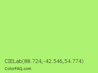 CIELab 88.724,-42.546,54.774 Color is a light green color and the nearest color is Inchworm #b2ec5d. Hex code #adf271 and RGB value is rgb(173,242,113). In RGB color space, this color is composed of 68% red, 95% green, 44% blue, In CMYK color space, this color is composed of 29% cyan, 0% magenta, 53% yellow , 5% black , In HSL color space, this color has a hue angle of 92° , 83% saturation and 70% lightness.