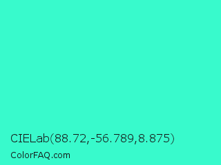 CIELab 88.72,-56.789,8.875 Color is a normal cyan color and the nearest color is Turquoise #40e0d0. Hex code #38facc and RGB value is rgb(56,250,204). In RGB color space, this color is composed of 22% red, 98% green, 80% blue, In CMYK color space, this color is composed of 78% cyan, 0% magenta, 18% yellow , 2% black , In HSL color space, this color has a hue angle of 166° , 95% saturation and 60% lightness.