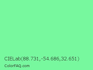 CIELab 88.731,-54.686,32.651 Color is a light green color and the nearest color is Light Green #90ee90. Hex code #78f89e and RGB value is rgb(120,248,158). In RGB color space, this color is composed of 47% red, 97% green, 62% blue, In CMYK color space, this color is composed of 52% cyan, 0% magenta, 36% yellow , 3% black , In HSL color space, this color has a hue angle of 138° , 90% saturation and 72% lightness.