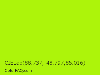 CIELab 88.737,-48.797,85.016 Color is a normal lime color and the nearest color is Spring Bud #a7fc00. Hex code #adf40a and RGB value is rgb(173,244,10). In RGB color space, this color is composed of 68% red, 96% green, 4% blue, In CMYK color space, this color is composed of 29% cyan, 0% magenta, 96% yellow , 4% black , In HSL color space, this color has a hue angle of 78° , 92% saturation and 50% lightness.