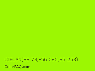 CIELab 88.73,-56.086,85.253 Color is a normal green color and the nearest color is Spring Bud #a7fc00. Hex code #9cf702 and RGB value is rgb(156,247,2). In RGB color space, this color is composed of 61% red, 97% green, 1% blue, In CMYK color space, this color is composed of 37% cyan, 0% magenta, 99% yellow , 3% black , In HSL color space, this color has a hue angle of 82° , 98% saturation and 49% lightness.