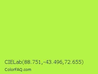 CIELab 88.751,-43.496,72.655 Color is a light green color and the nearest color is Green Lizard #a7f432. Hex code #b4f245 and RGB value is rgb(180,242,69). In RGB color space, this color is composed of 71% red, 95% green, 27% blue, In CMYK color space, this color is composed of 26% cyan, 0% magenta, 71% yellow , 5% black , In HSL color space, this color has a hue angle of 82° , 87% saturation and 61% lightness.
