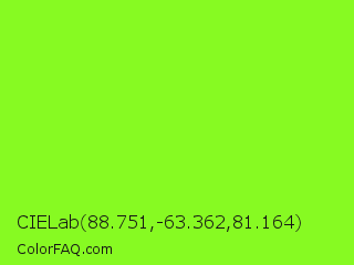 CIELab 88.751,-63.362,81.164 Color is a normal green color and the nearest color is Spring Frost #87ff2a. Hex code #87fa22 and RGB value is rgb(135,250,34). In RGB color space, this color is composed of 53% red, 98% green, 13% blue, In CMYK color space, this color is composed of 46% cyan, 0% magenta, 86% yellow , 2% black , In HSL color space, this color has a hue angle of 92° , 96% saturation and 56% lightness.