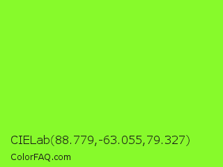 CIELab 88.779,-63.055,79.327 Color is a normal green color and the nearest color is Spring Frost #87ff2a. Hex code #87fa2b and RGB value is rgb(135,250,43). In RGB color space, this color is composed of 53% red, 98% green, 17% blue, In CMYK color space, this color is composed of 46% cyan, 0% magenta, 83% yellow , 2% black , In HSL color space, this color has a hue angle of 93° , 95% saturation and 57% lightness.
