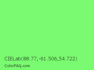 CIELab 88.77,-61.506,54.722 Color is a light green color and the nearest color is Screamin Green #66ff66. Hex code #7afa70 and RGB value is rgb(122,250,112). In RGB color space, this color is composed of 48% red, 98% green, 44% blue, In CMYK color space, this color is composed of 51% cyan, 0% magenta, 55% yellow , 2% black , In HSL color space, this color has a hue angle of 116° , 93% saturation and 71% lightness.