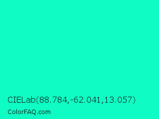 CIELab 88.784,-62.041,13.057 Color is a normal cyan color and the nearest color is Bright Turquoise #08e8de. Hex code #0ffcc4 and RGB value is rgb(15,252,196). In RGB color space, this color is composed of 6% red, 99% green, 77% blue, In CMYK color space, this color is composed of 94% cyan, 0% magenta, 22% yellow , 1% black , In HSL color space, this color has a hue angle of 166° , 98% saturation and 52% lightness.
