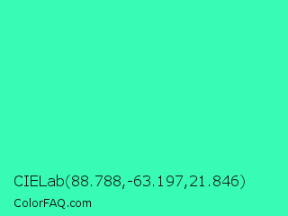 CIELab 88.788,-63.197,21.846 Color is a normal green color and the nearest color is Eucalyptus #44d7a8. Hex code #38fcb3 and RGB value is rgb(56,252,179). In RGB color space, this color is composed of 22% red, 99% green, 70% blue, In CMYK color space, this color is composed of 78% cyan, 0% magenta, 29% yellow , 1% black , In HSL color space, this color has a hue angle of 158° , 97% saturation and 60% lightness.