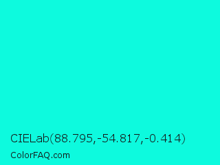 CIELab 88.795,-54.817,-0.414 Color is a normal cyan color and the nearest color is Bright Turquoise #08e8de. Hex code #0dfade and RGB value is rgb(13,250,222). In RGB color space, this color is composed of 5% red, 98% green, 87% blue, In CMYK color space, this color is composed of 95% cyan, 0% magenta, 11% yellow , 2% black , In HSL color space, this color has a hue angle of 173° , 96% saturation and 52% lightness.