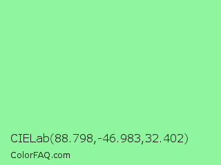 CIELab 88.798,-46.983,32.402 Color is a light green color and the nearest color is Pale Green #98fb98. Hex code #90f59f and RGB value is rgb(144,245,159). In RGB color space, this color is composed of 56% red, 96% green, 62% blue, In CMYK color space, this color is composed of 41% cyan, 0% magenta, 35% yellow , 4% black , In HSL color space, this color has a hue angle of 129° , 83% saturation and 76% lightness.