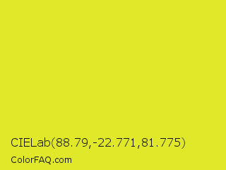 CIELab 88.79,-22.771,81.775 Color is a normal yellow color and the nearest color is Pear #d1e231. Hex code #e0e829 and RGB value is rgb(224,232,41). In RGB color space, this color is composed of 88% red, 91% green, 16% blue, In CMYK color space, this color is composed of 3% cyan, 0% magenta, 82% yellow , 9% black , In HSL color space, this color has a hue angle of 63° , 81% saturation and 54% lightness.