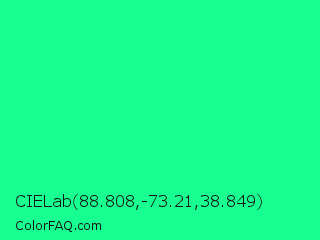 CIELab 88.808,-73.21,38.849 Color is a normal green color and the nearest color is Medium Spring Green #00fa9a. Hex code #18ff91 and RGB value is rgb(24,255,145). In RGB color space, this color is composed of 9% red, 100% green, 57% blue, In CMYK color space, this color is composed of 91% cyan, 0% magenta, 43% yellow , 0% black , In HSL color space, this color has a hue angle of 151° , 100% saturation and 55% lightness.