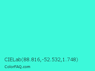 CIELab 88.816,-52.532,1.748 Color is a light cyan color and the nearest color is Turquoise #40e0d0. Hex code #3cf9da and RGB value is rgb(60,249,218). In RGB color space, this color is composed of 24% red, 98% green, 85% blue, In CMYK color space, this color is composed of 76% cyan, 0% magenta, 12% yellow , 2% black , In HSL color space, this color has a hue angle of 170° , 94% saturation and 61% lightness.