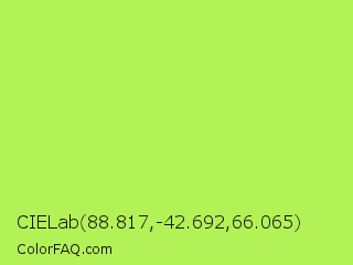 CIELab 88.817,-42.692,66.065 Color is a light green color and the nearest color is Inchworm #b2ec5d. Hex code #b3f257 and RGB value is rgb(179,242,87). In RGB color space, this color is composed of 70% red, 95% green, 34% blue, In CMYK color space, this color is composed of 26% cyan, 0% magenta, 64% yellow , 5% black , In HSL color space, this color has a hue angle of 84° , 86% saturation and 65% lightness.