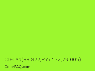 CIELab 88.822,-55.132,79.005 Color is a normal green color and the nearest color is French Lime #9efd38. Hex code #9cf72e and RGB value is rgb(156,247,46). In RGB color space, this color is composed of 61% red, 97% green, 18% blue, In CMYK color space, this color is composed of 37% cyan, 0% magenta, 81% yellow , 3% black , In HSL color space, this color has a hue angle of 87° , 93% saturation and 57% lightness.