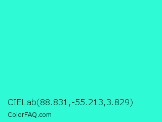 CIELab 88.831,-55.213,3.829 Color is a normal cyan color and the nearest color is Turquoise #40e0d0. Hex code #2efad6 and RGB value is rgb(46,250,214). In RGB color space, this color is composed of 18% red, 98% green, 84% blue, In CMYK color space, this color is composed of 82% cyan, 0% magenta, 14% yellow , 2% black , In HSL color space, this color has a hue angle of 169° , 95% saturation and 58% lightness.