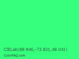 CIELab 88.846,-73.821,48.041 Color is a light green color and the nearest color is UFO Green #3cd070. Hex code #37ff7e and RGB value is rgb(55,255,126). In RGB color space, this color is composed of 22% red, 100% green, 49% blue, In CMYK color space, this color is composed of 78% cyan, 0% magenta, 51% yellow , 0% black , In HSL color space, this color has a hue angle of 141° , 100% saturation and 61% lightness.