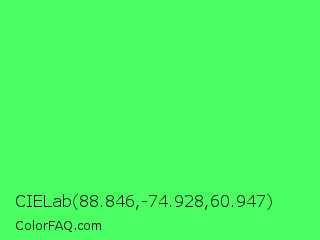 CIELab 88.846,-74.928,60.947 Color is a light green color and the nearest color is Screamin Green #66ff66. Hex code #4aff61 and RGB value is rgb(74,255,97). In RGB color space, this color is composed of 29% red, 100% green, 38% blue, In CMYK color space, this color is composed of 71% cyan, 0% magenta, 62% yellow , 0% black , In HSL color space, this color has a hue angle of 128° , 100% saturation and 65% lightness.