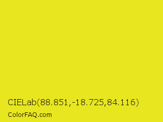 CIELab 88.851,-18.725,84.116 Color is a normal yellow color and the nearest color is Piss Yellow #e1e115. Hex code #e8e61f and RGB value is rgb(232,230,31). In RGB color space, this color is composed of 91% red, 90% green, 12% blue, In CMYK color space, this color is composed of 0% cyan, 1% magenta, 87% yellow , 9% black , In HSL color space, this color has a hue angle of 59° , 81% saturation and 52% lightness.