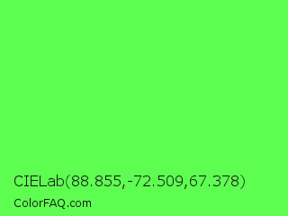 CIELab 88.855,-72.509,67.378 Color is a light green color and the nearest color is Screamin Green #66ff66. Hex code #5efe51 and RGB value is rgb(94,254,81). In RGB color space, this color is composed of 37% red, 100% green, 32% blue, In CMYK color space, this color is composed of 63% cyan, 0% magenta, 68% yellow , 0% black , In HSL color space, this color has a hue angle of 115° , 99% saturation and 66% lightness.