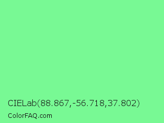 CIELab 88.867,-56.718,37.802 Color is a light green color and the nearest color is Light Green #90ee90. Hex code #78f994 and RGB value is rgb(120,249,148). In RGB color space, this color is composed of 47% red, 98% green, 58% blue, In CMYK color space, this color is composed of 52% cyan, 0% magenta, 41% yellow , 2% black , In HSL color space, this color has a hue angle of 133° , 91% saturation and 72% lightness.