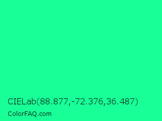 CIELab 88.877,-72.376,36.487 Color is a normal green color and the nearest color is Medium Spring Green #00fa9a. Hex code #17ff96 and RGB value is rgb(23,255,150). In RGB color space, this color is composed of 9% red, 100% green, 59% blue, In CMYK color space, this color is composed of 91% cyan, 0% magenta, 41% yellow , 0% black , In HSL color space, this color has a hue angle of 153° , 100% saturation and 55% lightness.