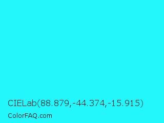 CIELab 88.879,-44.374,-15.915 Color is a normal cyan color and the nearest color is Loeen #15f2fd. Hex code #23f7fc and RGB value is rgb(35,247,252). In RGB color space, this color is composed of 14% red, 97% green, 99% blue, In CMYK color space, this color is composed of 86% cyan, 2% magenta, 0% yellow , 1% black , In HSL color space, this color has a hue angle of 181° , 97% saturation and 56% lightness.