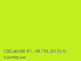 CIELab 88.87,-38.791,83.014 Color is a normal lime color and the nearest color is Las Palmas #c6e610. Hex code #c2f01f and RGB value is rgb(194,240,31). In RGB color space, this color is composed of 76% red, 94% green, 12% blue, In CMYK color space, this color is composed of 19% cyan, 0% magenta, 87% yellow , 6% black , In HSL color space, this color has a hue angle of 73° , 87% saturation and 53% lightness.