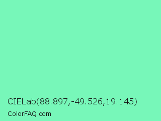 CIELab 88.897,-49.526,19.145 Color is a light green color and the nearest color is Aquamarine #7fffd4. Hex code #77f7b9 and RGB value is rgb(119,247,185). In RGB color space, this color is composed of 47% red, 97% green, 73% blue, In CMYK color space, this color is composed of 52% cyan, 0% magenta, 25% yellow , 3% black , In HSL color space, this color has a hue angle of 151° , 89% saturation and 72% lightness.