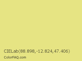 CIELab 88.898,-12.824,47.406 Color is a light yellow color and the nearest color is Flax #eedc82. Hex code #e6e483 and RGB value is rgb(230,228,131). In RGB color space, this color is composed of 90% red, 89% green, 51% blue, In CMYK color space, this color is composed of 0% cyan, 1% magenta, 43% yellow , 10% black , In HSL color space, this color has a hue angle of 59° , 66% saturation and 71% lightness.