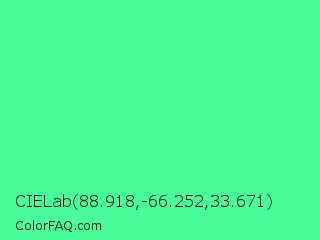 CIELab 88.918,-66.252,33.671 Color is a light green color and the nearest color is Eucalyptus #44d7a8. Hex code #47fd9c and RGB value is rgb(71,253,156). In RGB color space, this color is composed of 28% red, 99% green, 61% blue, In CMYK color space, this color is composed of 72% cyan, 0% magenta, 38% yellow , 1% black , In HSL color space, this color has a hue angle of 148° , 98% saturation and 64% lightness.
