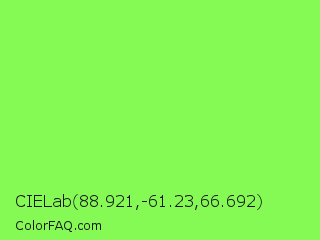 CIELab 88.921,-61.23,66.692 Color is a light green color and the nearest color is Kiwi #8ee53f. Hex code #85fa54 and RGB value is rgb(133,250,84). In RGB color space, this color is composed of 52% red, 98% green, 33% blue, In CMYK color space, this color is composed of 47% cyan, 0% magenta, 66% yellow , 2% black , In HSL color space, this color has a hue angle of 102° , 94% saturation and 65% lightness.