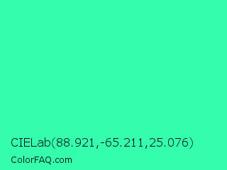 CIELab 88.921,-65.211,25.076 Color is a normal green color and the nearest color is Eucalyptus #44d7a8. Hex code #34fdad and RGB value is rgb(52,253,173). In RGB color space, this color is composed of 20% red, 99% green, 68% blue, In CMYK color space, this color is composed of 79% cyan, 0% magenta, 32% yellow , 1% black , In HSL color space, this color has a hue angle of 156° , 98% saturation and 60% lightness.