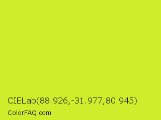 CIELab 88.926,-31.977,80.945 Color is a normal yellow color and the nearest color is Pear #d1e231. Hex code #cfed2b and RGB value is rgb(207,237,43). In RGB color space, this color is composed of 81% red, 93% green, 17% blue, In CMYK color space, this color is composed of 13% cyan, 0% magenta, 82% yellow , 7% black , In HSL color space, this color has a hue angle of 69° , 84% saturation and 55% lightness.