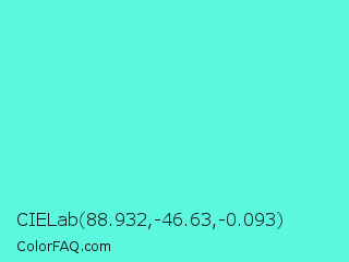 CIELab 88.932,-46.63,-0.093 Color is a light cyan color and the nearest color is Turquoise Blue #6cdae7. Hex code #5bf7de and RGB value is rgb(91,247,222). In RGB color space, this color is composed of 36% red, 97% green, 87% blue, In CMYK color space, this color is composed of 63% cyan, 0% magenta, 10% yellow , 3% black , In HSL color space, this color has a hue angle of 170° , 91% saturation and 66% lightness.