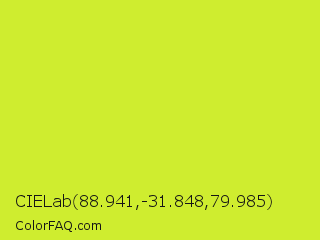CIELab 88.941,-31.848,79.985 Color is a normal yellow color and the nearest color is Pear #d1e231. Hex code #cfed2f and RGB value is rgb(207,237,47). In RGB color space, this color is composed of 81% red, 93% green, 18% blue, In CMYK color space, this color is composed of 13% cyan, 0% magenta, 80% yellow , 7% black , In HSL color space, this color has a hue angle of 69° , 84% saturation and 56% lightness.