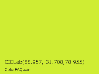 CIELab 88.957,-31.708,78.955 Color is a normal yellow color and the nearest color is Pear #d1e231. Hex code #cfed33 and RGB value is rgb(207,237,51). In RGB color space, this color is composed of 81% red, 93% green, 20% blue, In CMYK color space, this color is composed of 13% cyan, 0% magenta, 78% yellow , 7% black , In HSL color space, this color has a hue angle of 70° , 84% saturation and 56% lightness.